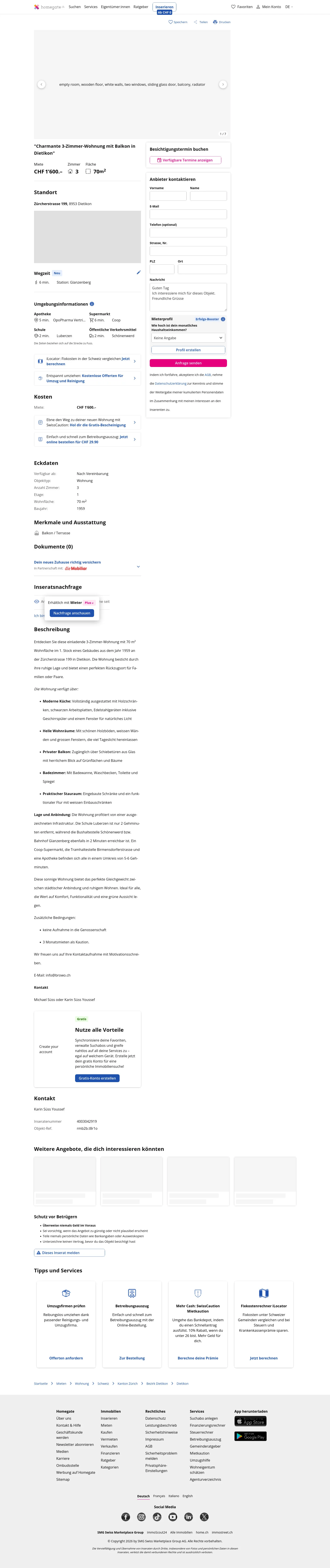 This 3.0-room apartment in Dietikon (8953) offers 70 m² of living space and is situated on the 1st floor of a building from 1959 at Zürcherstrasse 199. Rent: CHF 1,600/month.
