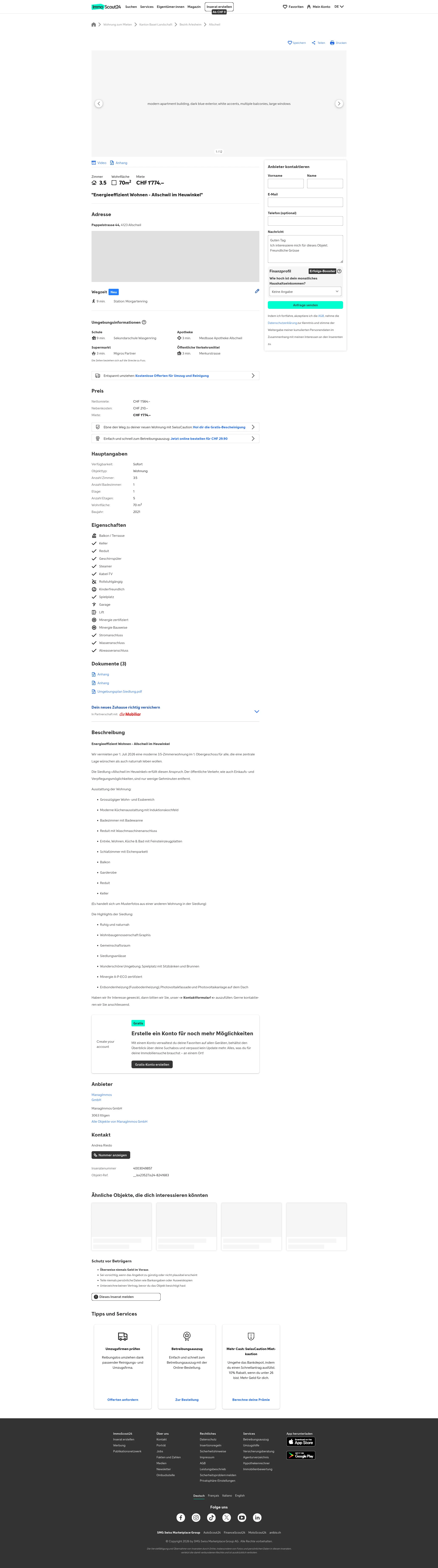 This modern 3.5-room apartment on the 1st floor in Allschwil (4123) offers 70 m² of living space and is available from 1 July 2026.