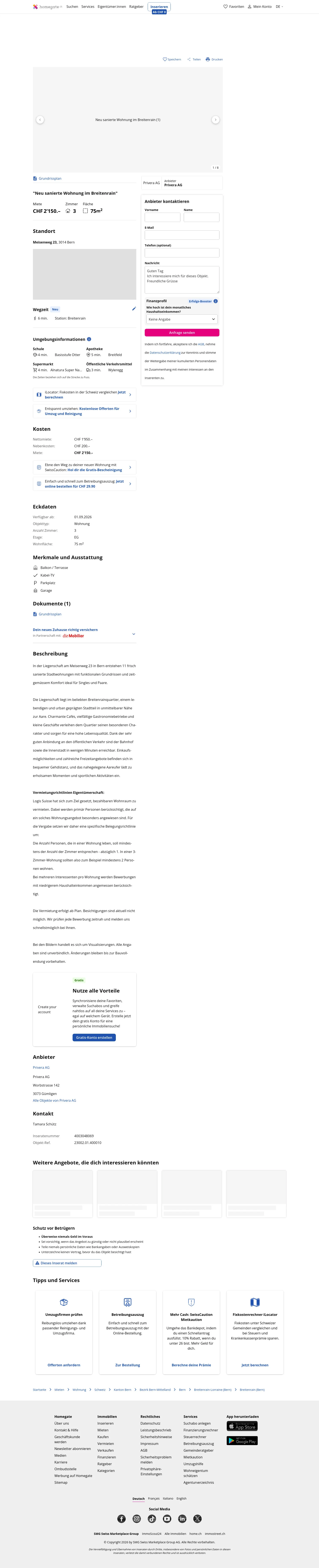 This 3.0-room apartment at Meisenweg 23, 3014 Bern offers 75 m² of living space and a rent of CHF 2,150/month.