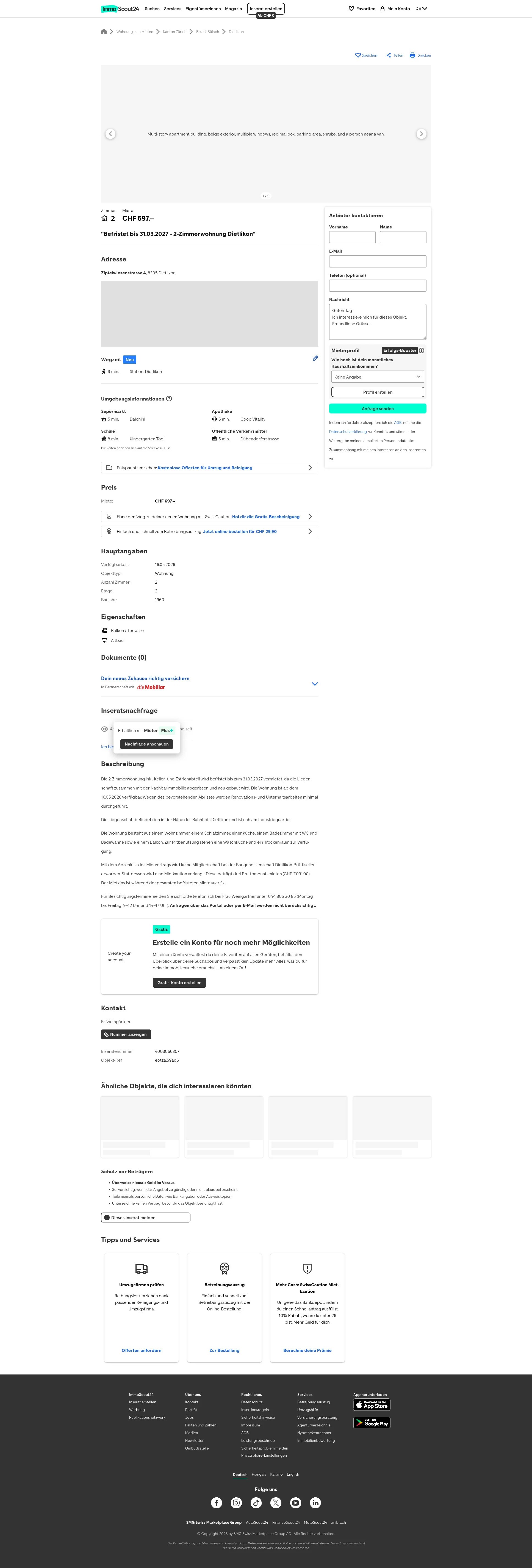 This 2-room apartment in Dietlikon (8305) is rented on a fixed-term basis until 31 March 2027 and is available from 16 May 2026. The building will be demolished and rebuilt together with the neighbouring property; consequently, renovation and maintenance work will be kept to a minimum.