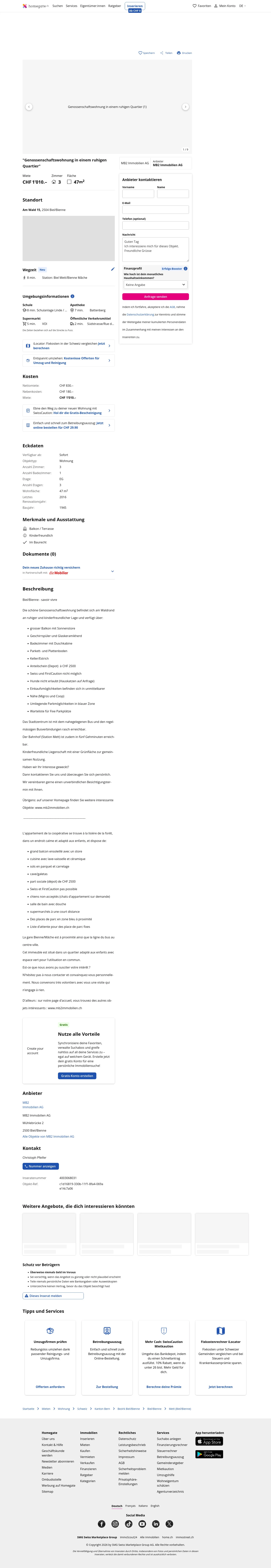 This 3.0-room apartment in Biel (2504) offers 47 m² of living space and is available from 01.04.2026.