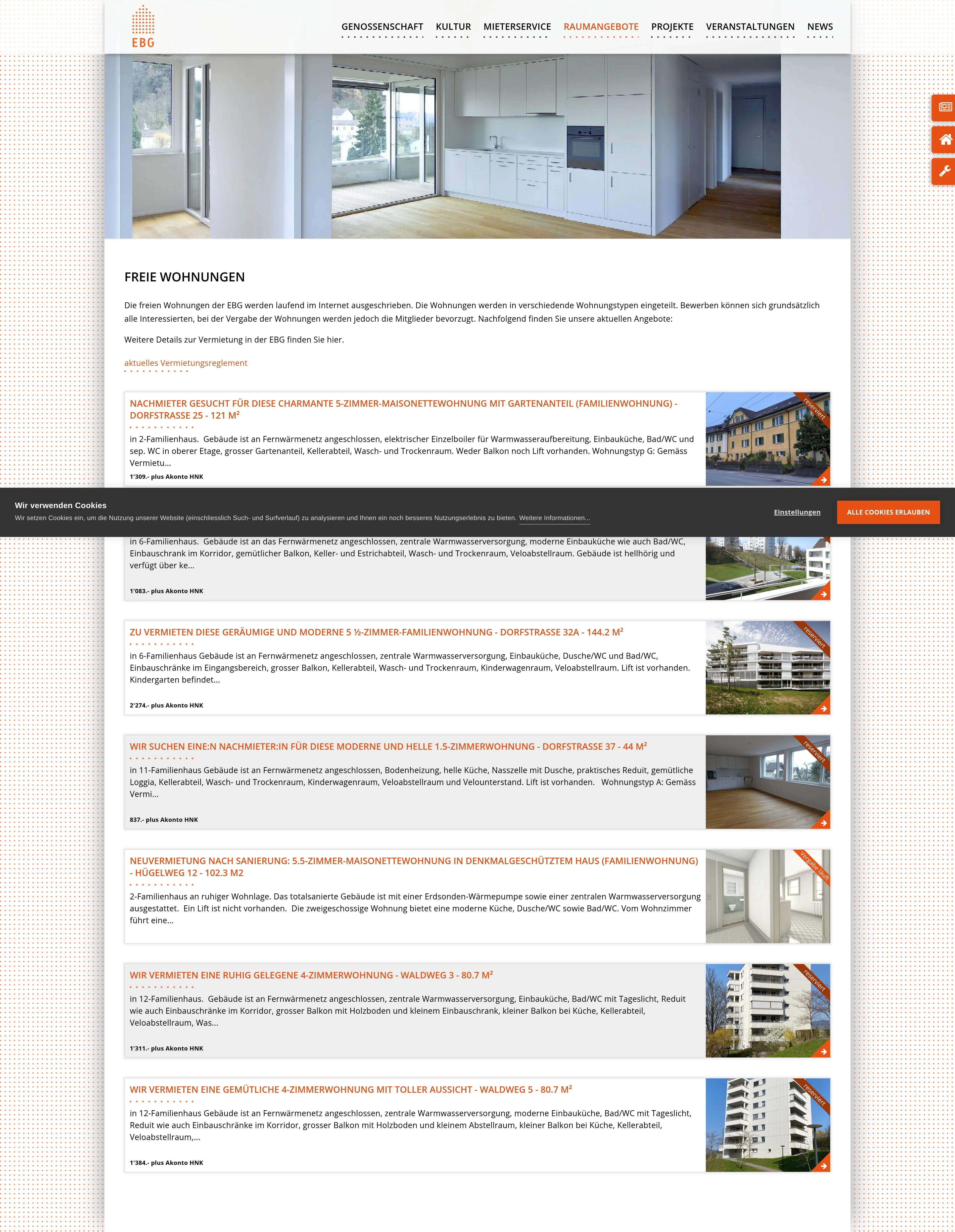| Belegungsvorschriften | Wohnungstyp G: Gemäss Vermietungsreglement haben Bewerbungen mit 4 bis 7 Personen Vorrang. Gemäss Vermietungsreglement der EBG werden Familienwohnungen nur bis zum 30. Geburtstag des jüngsten eigenen Kindes vermietet. |