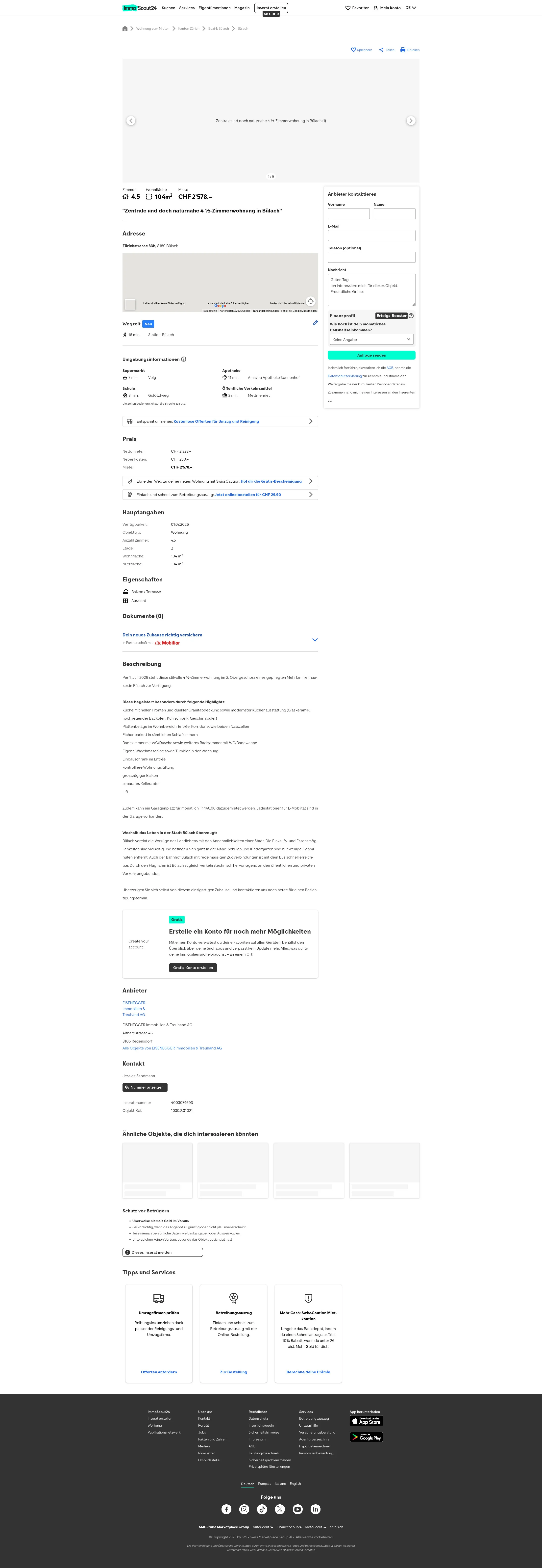 This stylish 4.5-room apartment on the 2nd floor of a well-maintained multi-family building in Bülach (8180) is available from 1 July 2026.