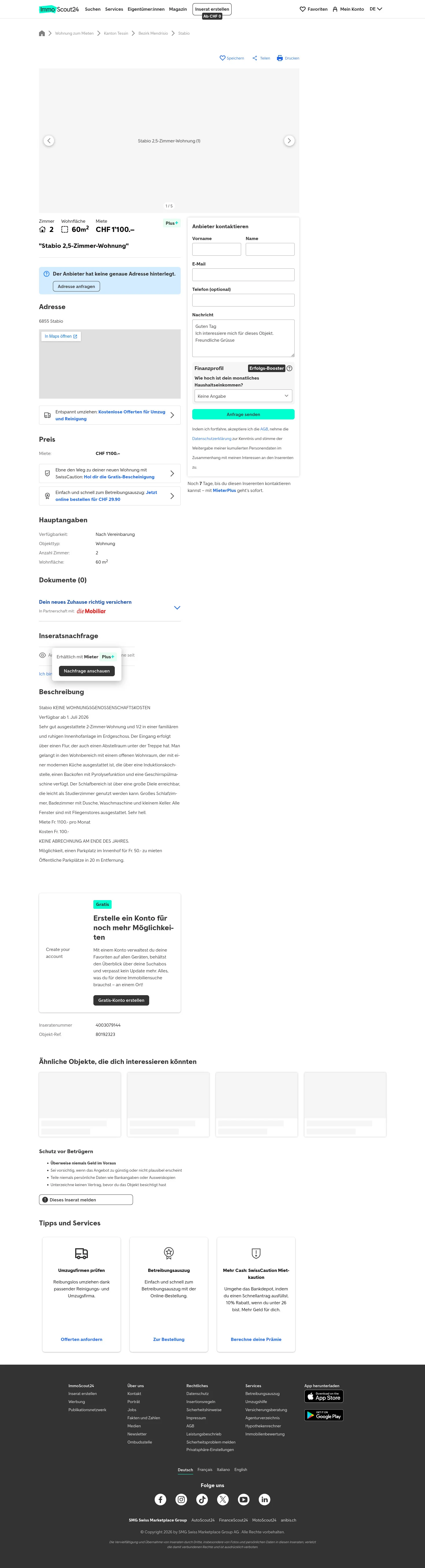 This 2-room apartment in Stabio (6855) offers 60 m² of living space and is available from 1 July 2026.