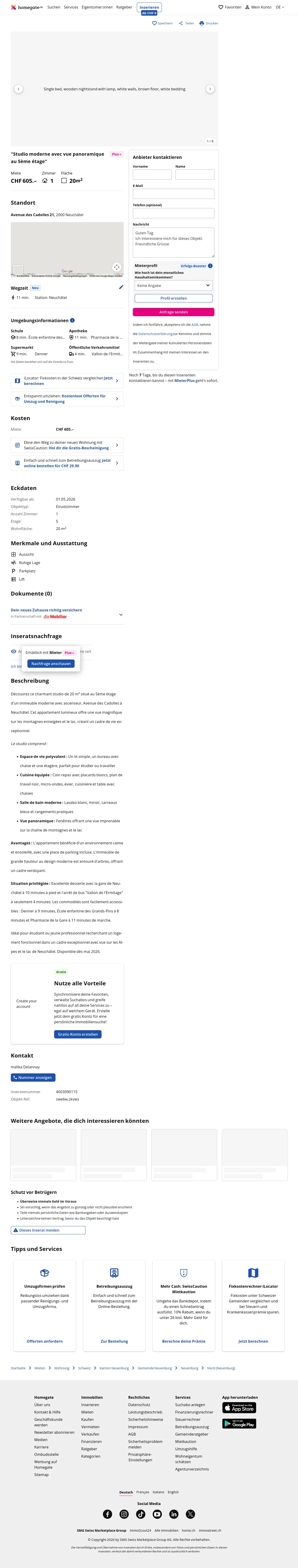 This 1.0-room studio is located on the 5th floor of a modern building with an elevator at Avenue des Cadolles, 2000 Neuchâtel. The studio offers 20 m² of living space and panoramic views of the surrounding mountains and the lake. The cooperative is Alfen SA.