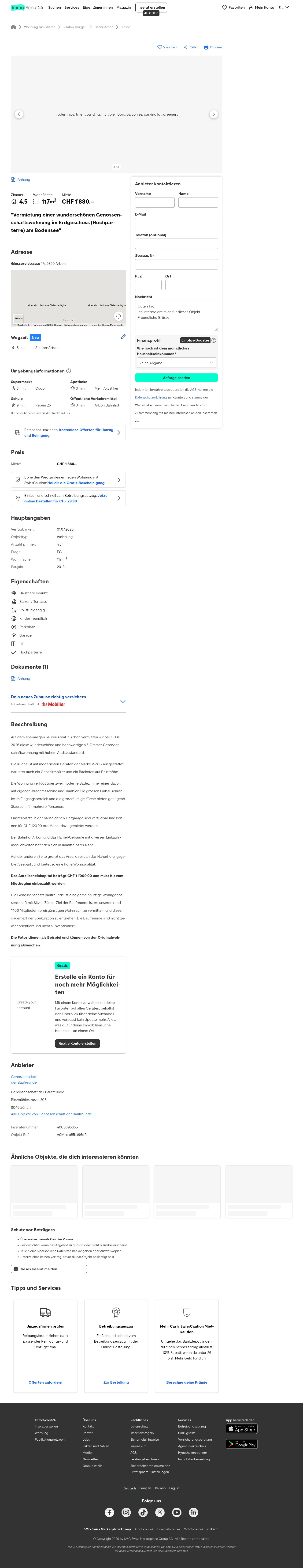 This 4.5-room cooperative apartment in Arbon (9320) offers 117 m² of living space and is available from 1 July 2026.