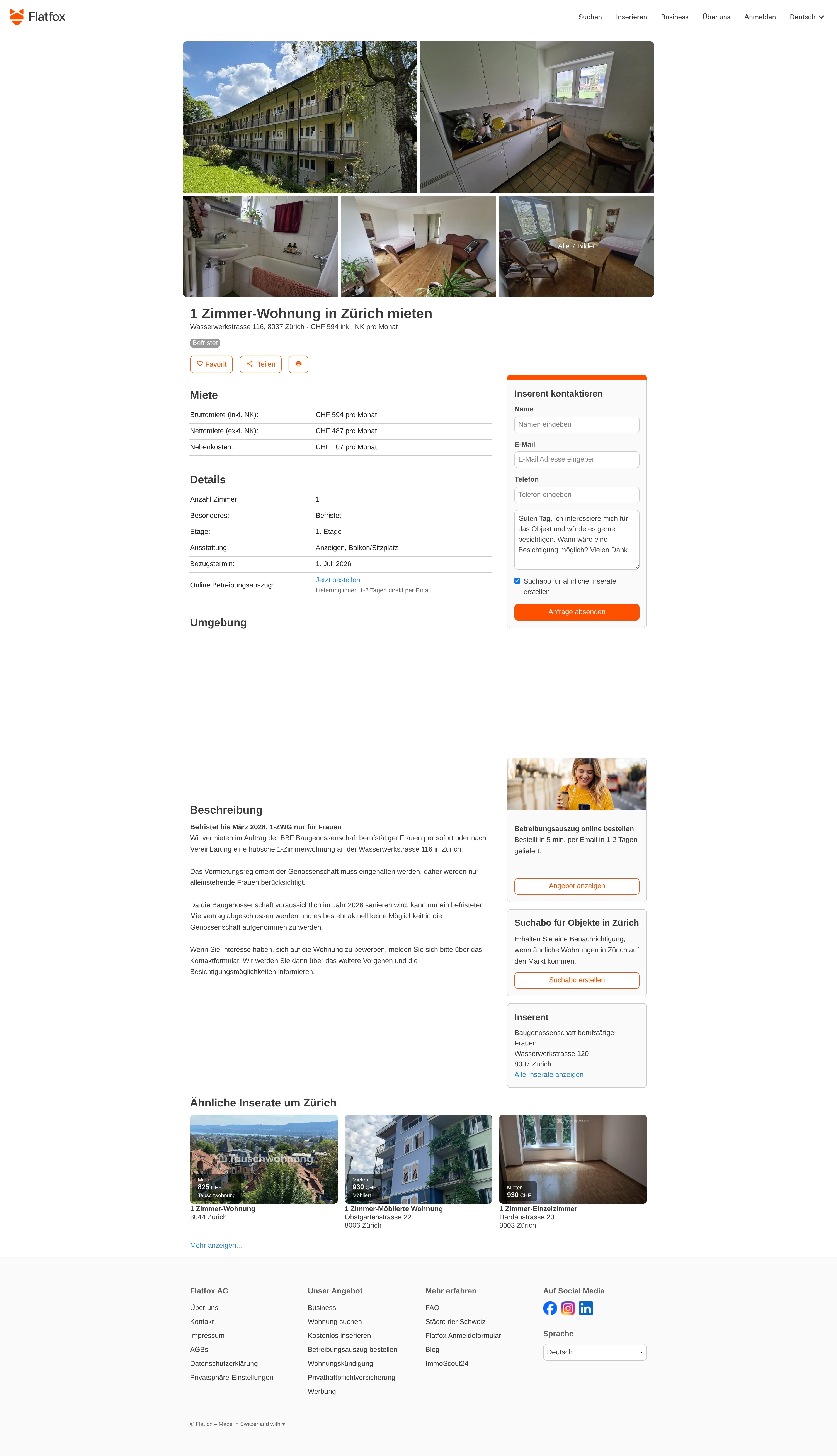 This 1-room apartment is located at Wasserwerkstrasse 116, 8037 Zürich and is listed under the cooperative Baugenossenschaft für neuzeitliches Wohnen.