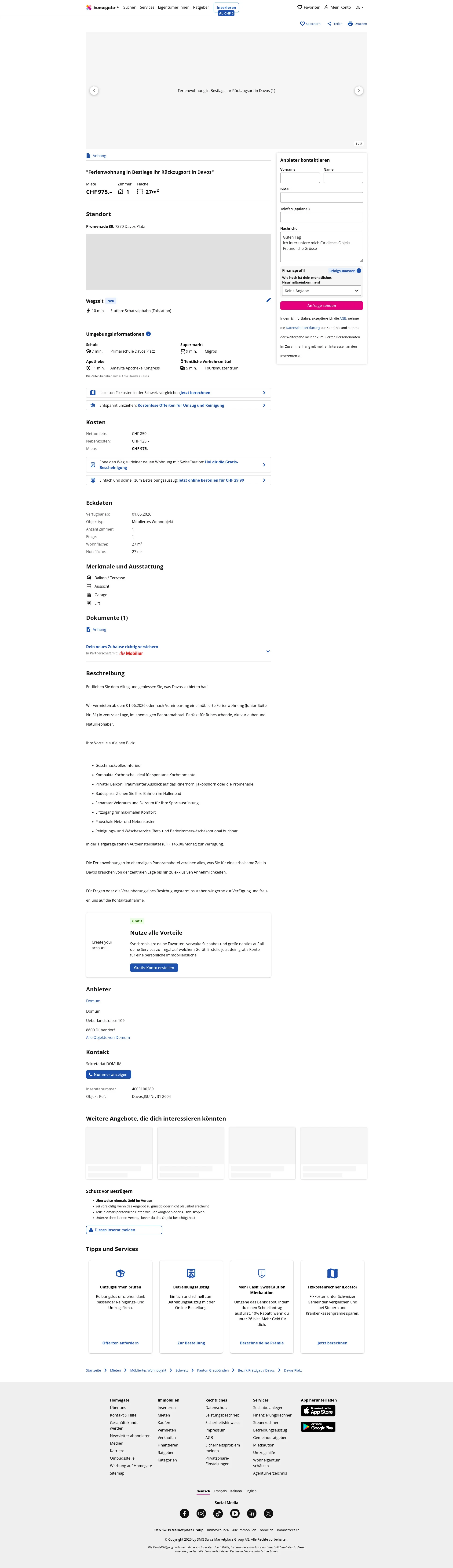 This furnished holiday apartment (Junior-Suite No. 31) in the former Panoramahotel is centrally located in Davos Platz (7270). The 1.0-room apartment offers 27 m² of living space.