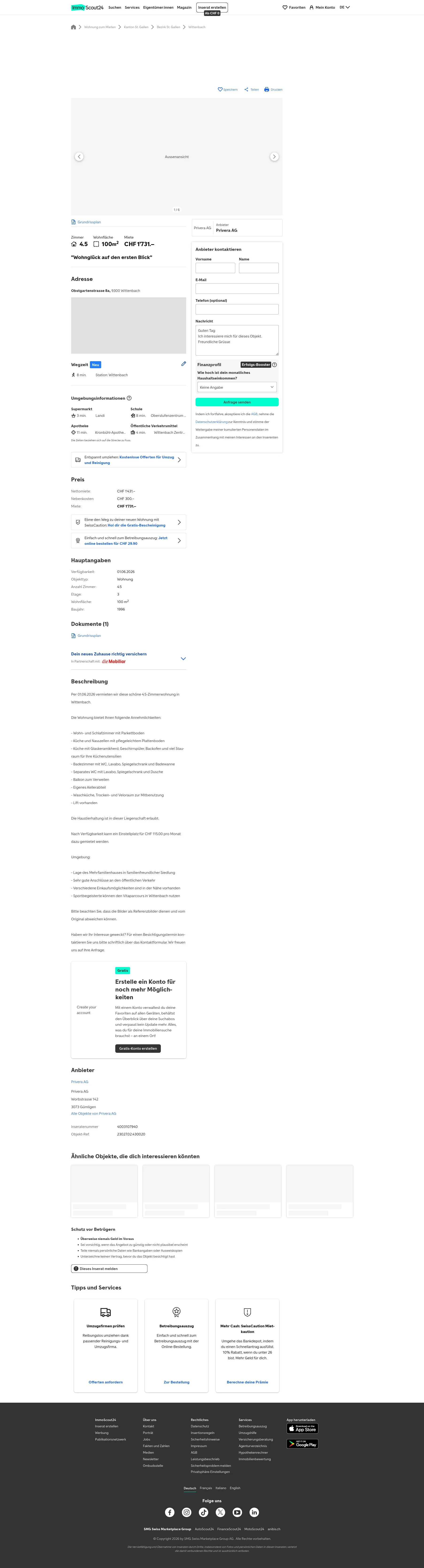 This 4.5-room apartment in Wittenbach (9300) offers 100 m² of living space and is available from 1 June 2026.
