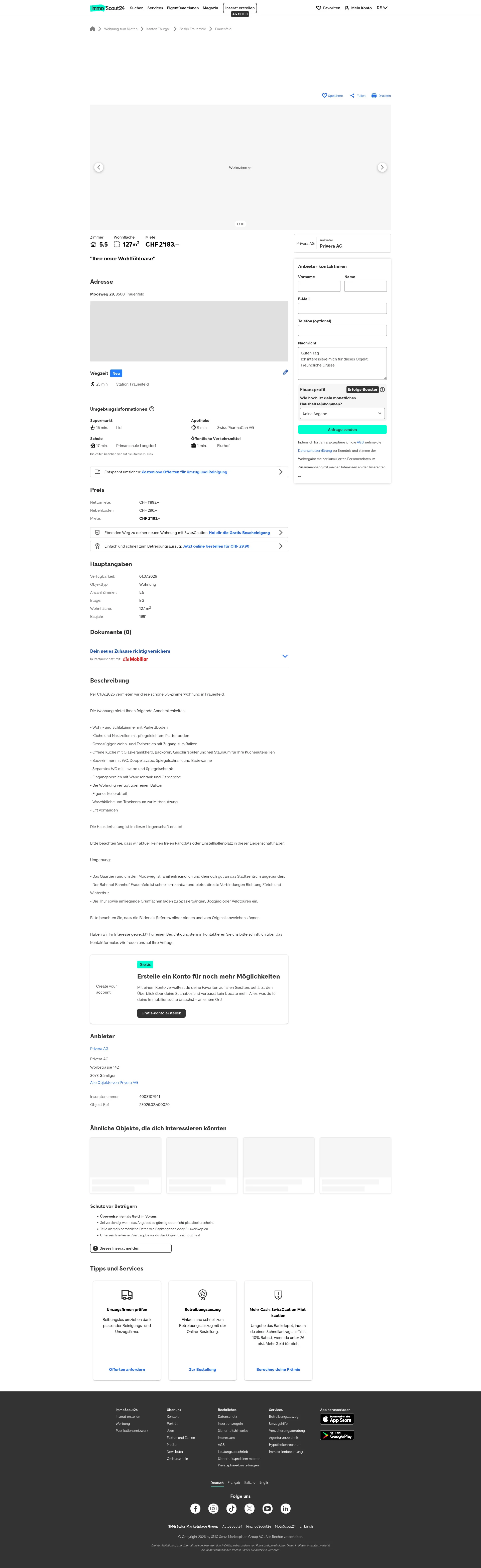 This 5.5-room apartment in Frauenfeld (8500) offers 127 m² of living space. The apartment is listed with a rent of CHF 2,183/month and is managed by the cooperative Logis Suisse AG. The apartment is available from 1 July 2026.