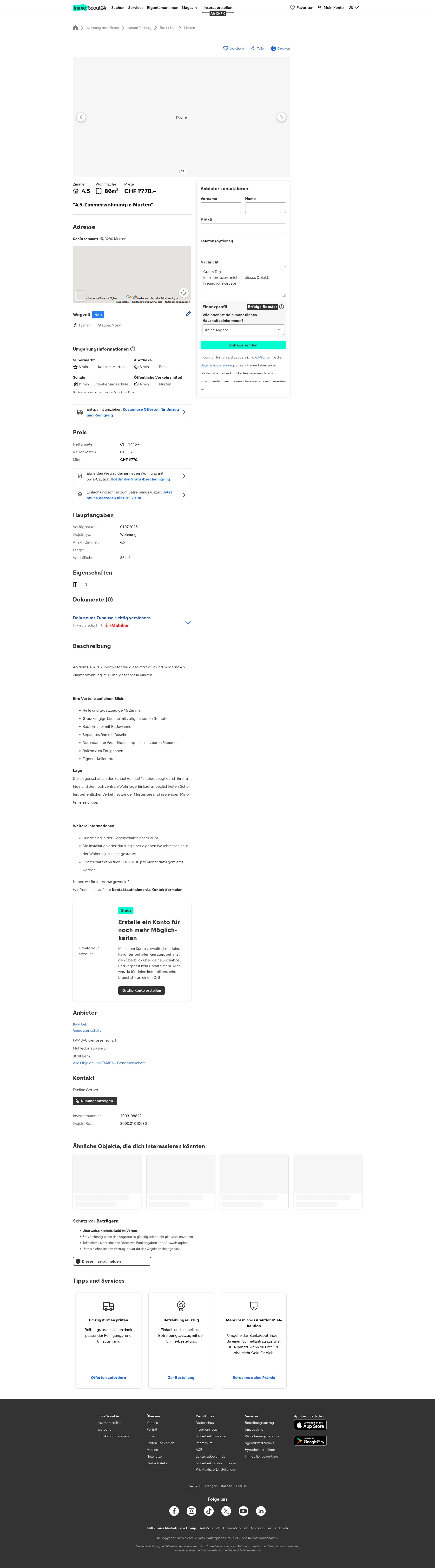 This 4.5-room apartment on the 1st floor at Schuetzenmatt 15, 3280 Murten offers 86 m² of living space. The apartment is available from 01.07.2026.