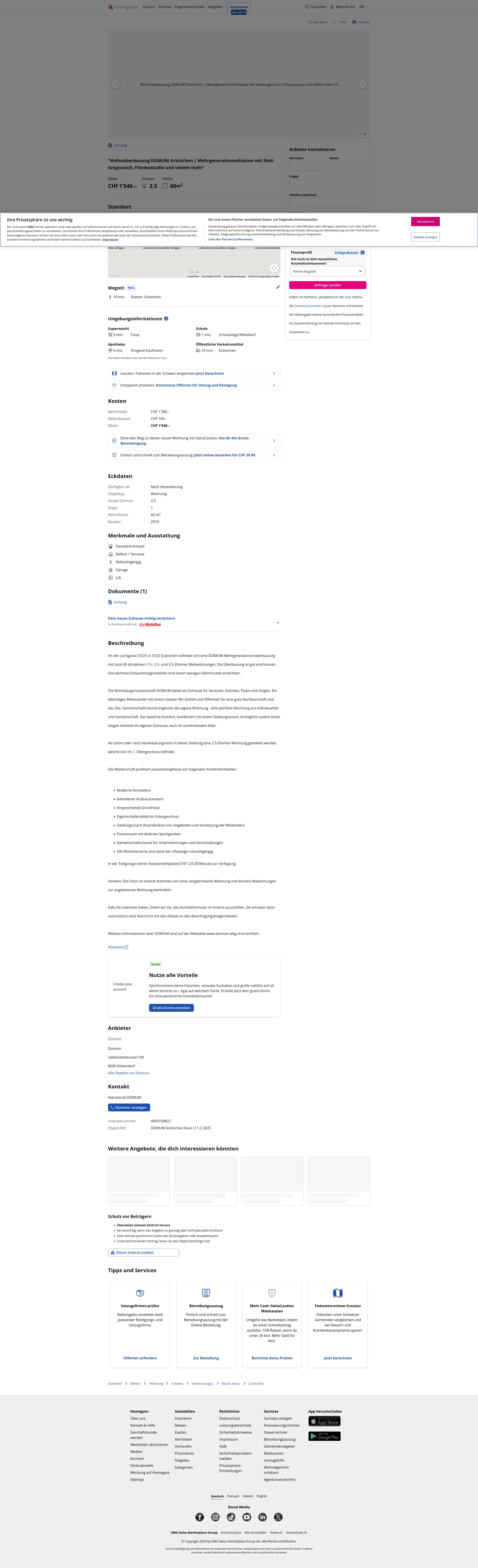 This property at Lochgasse 23/25, 5722 Gränichen is part of a Domum Wohnbaugenossenschaft multigeneration development comprising a total of 40 apartments in 1.5-, 2.5- and 3.5-room layouts.