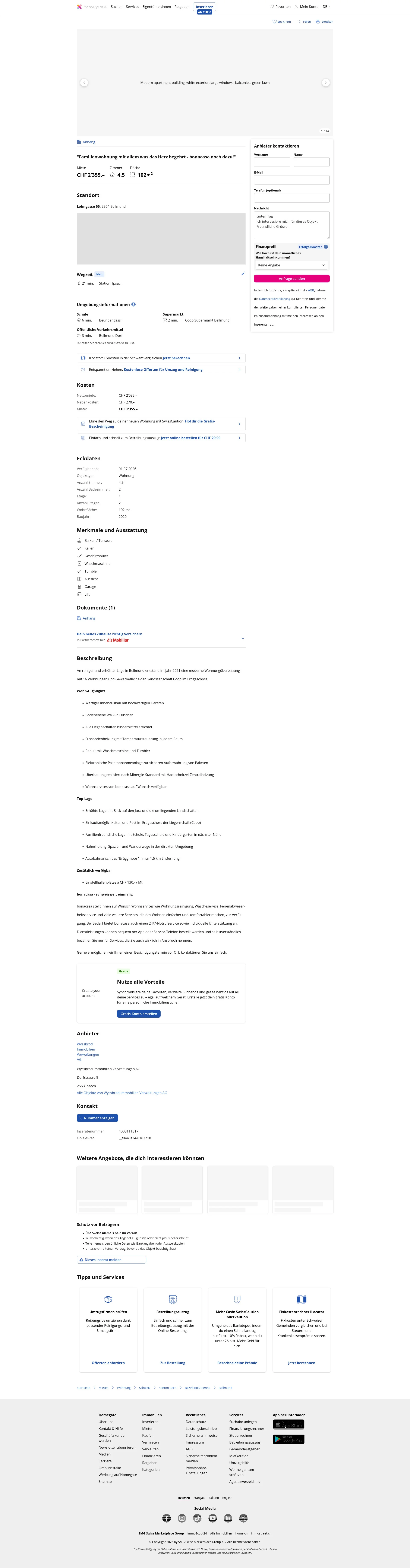 This 4.5-room apartment in Bellmund (2564) provides 102 m² of living space and is part of a modern residential development completed in 2021. The development comprises 16 apartments and commercial space, with a Coop on the ground floor.