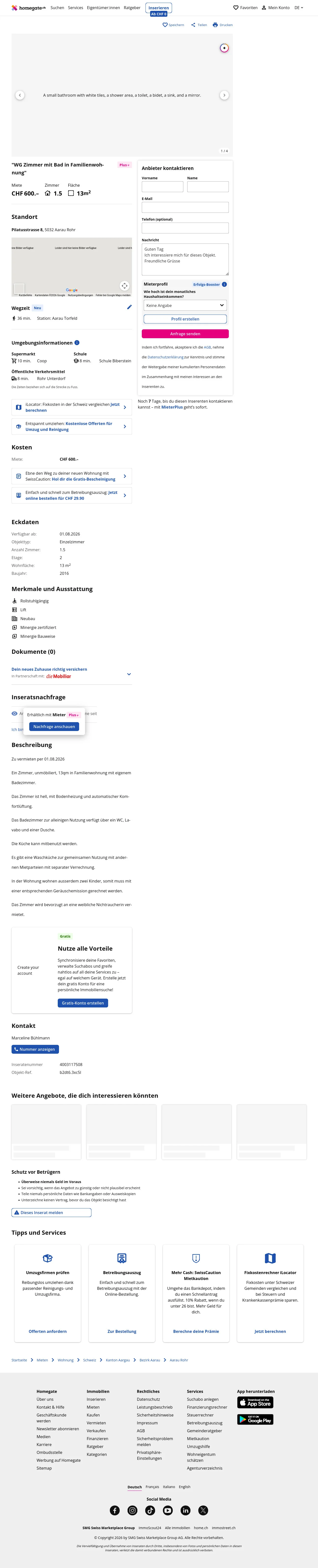 This unfurnished room is available from 01.08.2026 in Rohr (5032). It is part of a 1.5-room family apartment and offers 13 m² of living space.